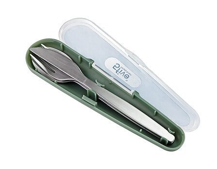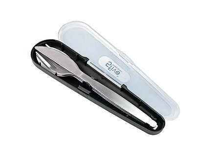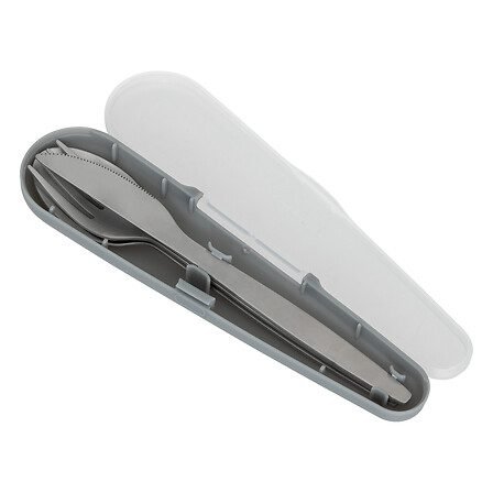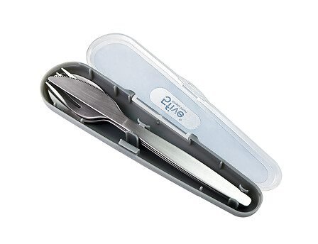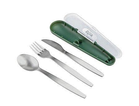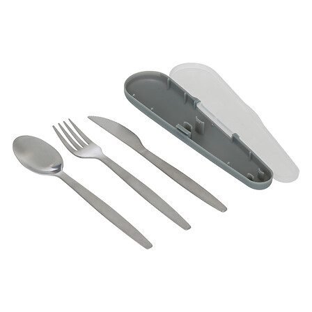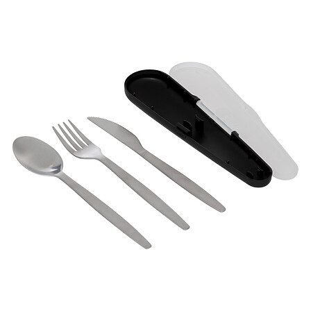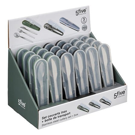 - Set de 3 couverts en inox dans leur boîte de transport. 1 référence en assorti de 3 couleurs. Vendu en display.
