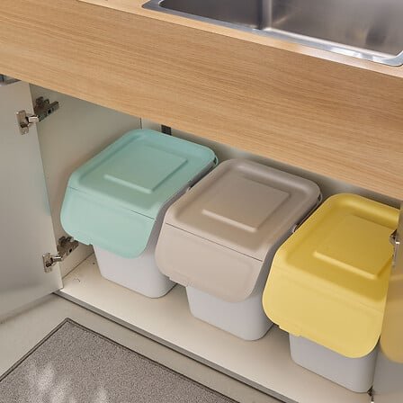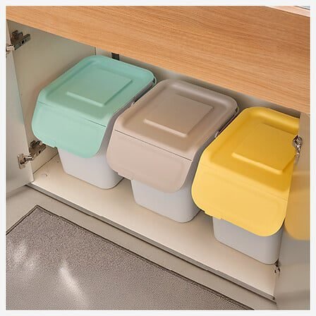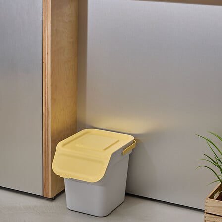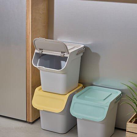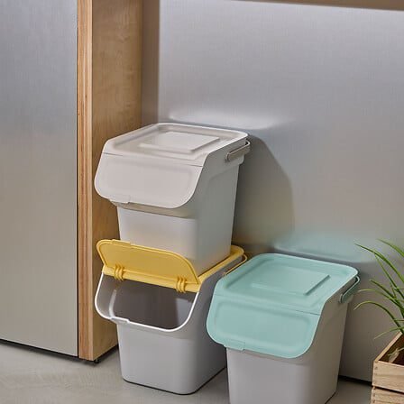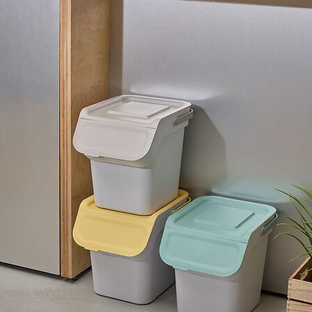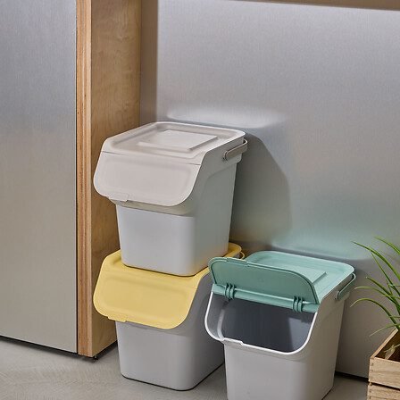 - Poubelles de tri empilables en plastique. Facile à transporter : anse Assortiment : vert, jaune, beige Colisage de 4 : 1x vert, 1x jaune, 2x beige