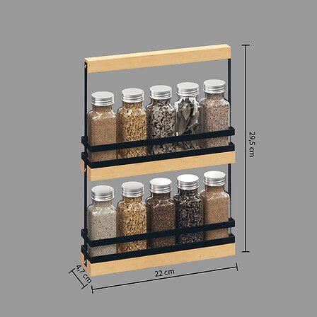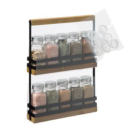Blackwood rack of 10 glass jars including spices with wood and metal stand