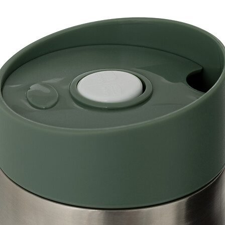 - Mug isotherme de 0.35L en inox avec une bande en silicone pour une meilleure prise en main. Fermeture et ouverture avec bouton-poussoir.