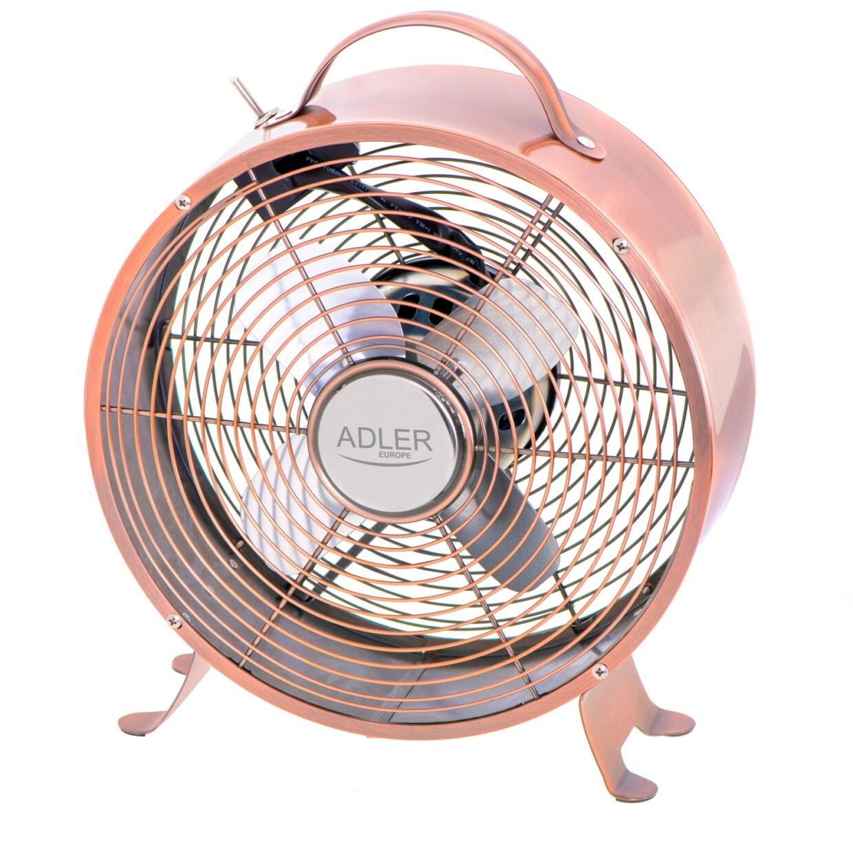 Efficient 50W fan. It cools the room and provides more fresh air in it. It has a stable base, which means that it can be placed even on an uneven surface without fear of falling over. The metal propeller provides a large air flow of 21.64 m3 / min. The AD 7324 fan has a diameter of 20 cm, is small and has a copper surface in a loft style. Two speeds allow you to decide on the blowing force.