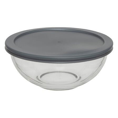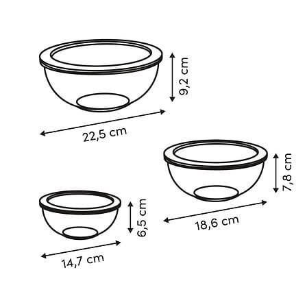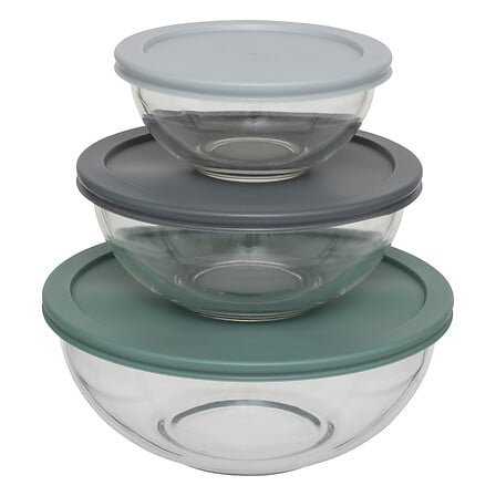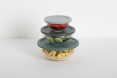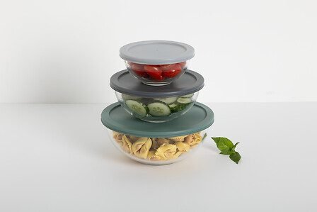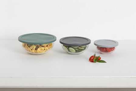 - Set de trois bols de conservation en verre borosilicate, avec couvercle en polypropylène. Contenances : 450ml, 1L et 2L
