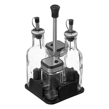 Set of glass oil and vinegar bottles 0.17 l and salt and pepper pots with stand